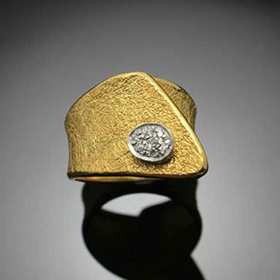 This finely shaped 18K gold ring has a unique handmade scratched surface. Decorated with an extra piece of white gold with diamonds, this timeless jewelry is sure to offer you class and elegance. This gorgeous gold ring is great for grand occasions.