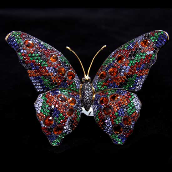 The darling ladies' brooch touts an enchanting butterfly design, which is meticulously crafted with 18K gold. Skilled craftsmanship is revealed without reservation by the delicately set multi-color sapphire stones all over. This 18K gold sapphire butterfly brooch takes your breath away with its irresistible beauty.