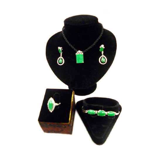 This jewelry set comes with a ring, a bracelet, a pair of earrings and a pendant. This stylish jewelry set is made of 18K jadeite for an elegant touch. This 18K jadeite jewelry set makes a pretty way to complement your stylish look.