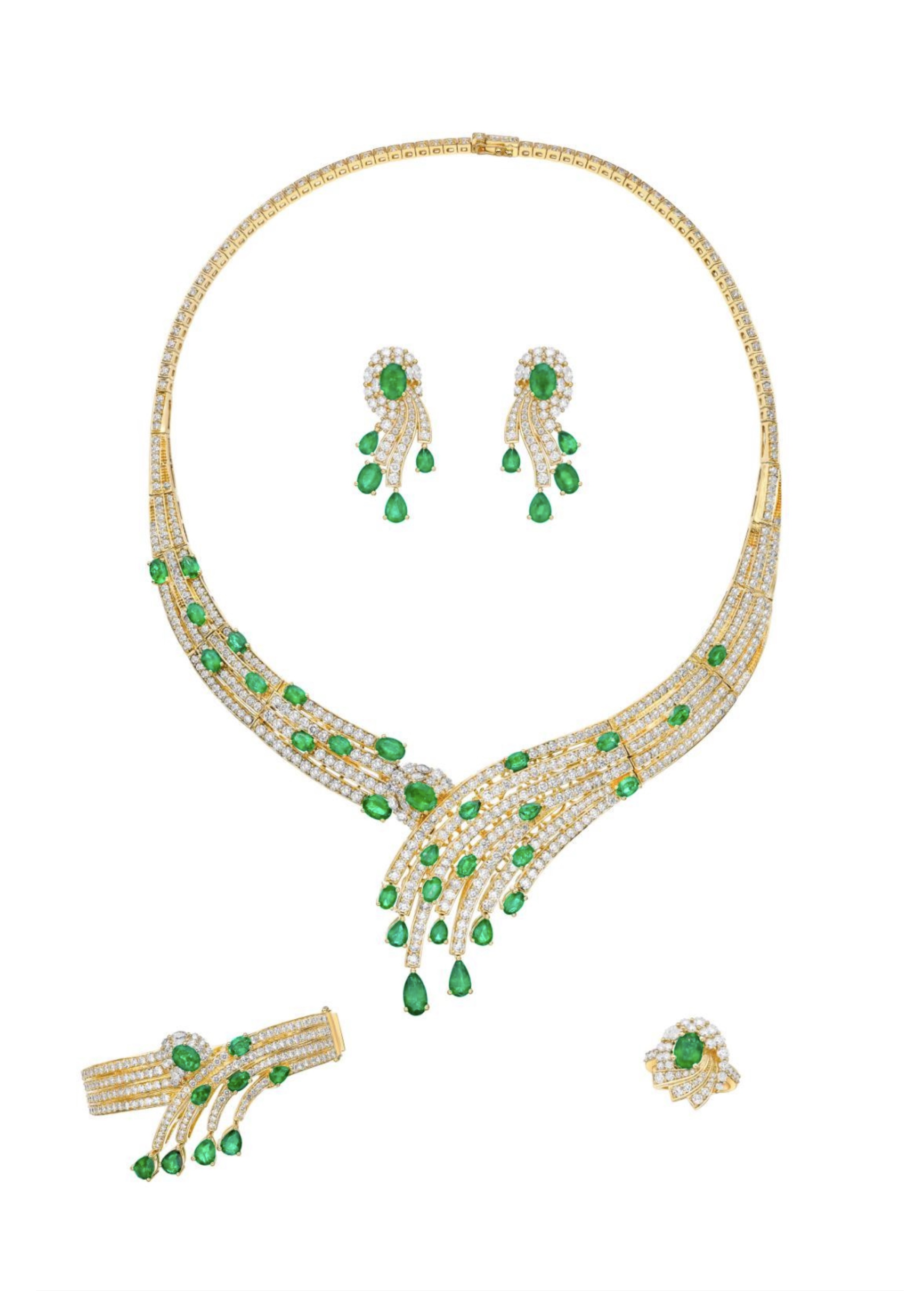 yellow gold 18K, 243 grams, Diamonds 33 ct, Emeralds 26 ct