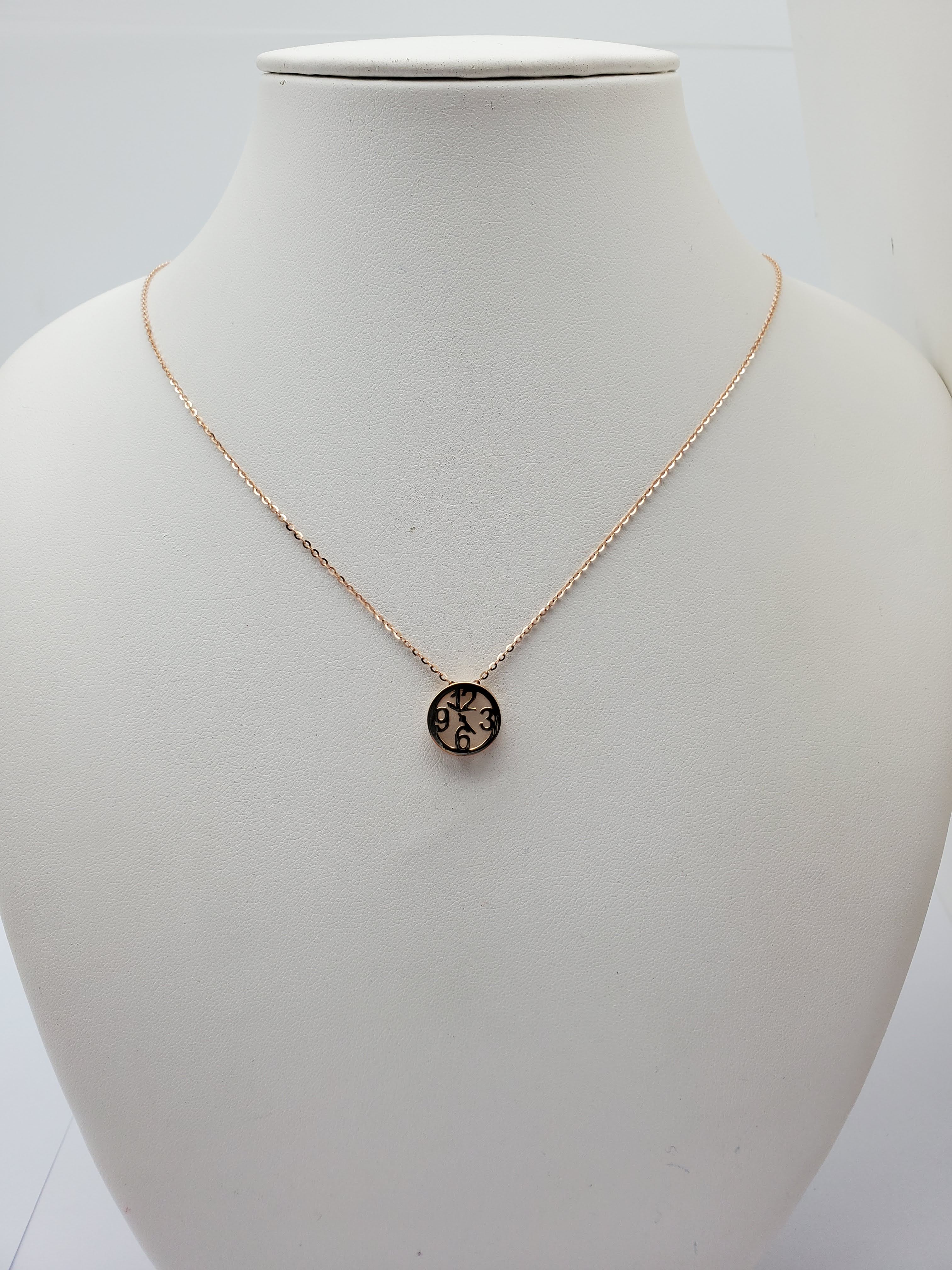 An interesting necklace hanging with a clock like design in the middle of the chain.
