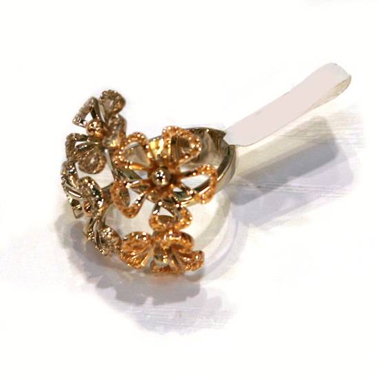 This is a 18K pink and white gold ring. There are four open work floral patterns on it. All the flowers have five petals and are of slightly different sizes. The sparkling gold reflects light nicely and adds elegance to this ring.