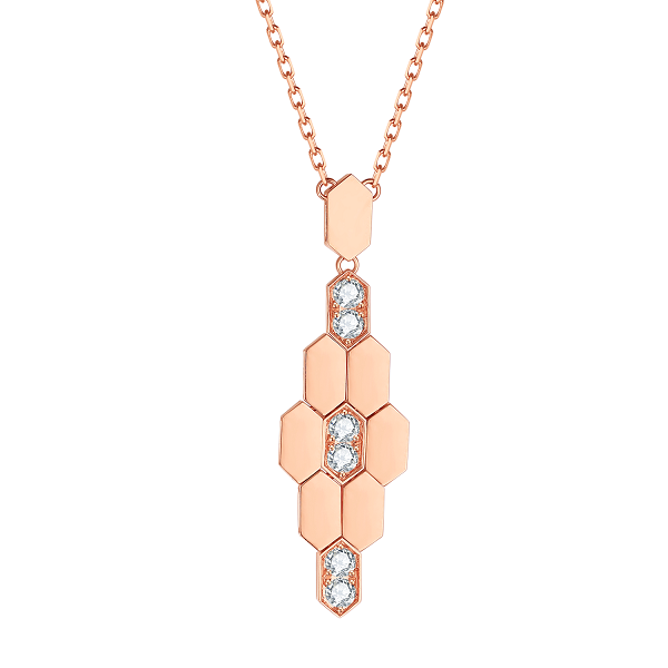 Its pendant features a unique arrangement of interlocking hexagons, some delicately set with sparkling clear gemstones that catch the light with every turn. The fine rose gold chain complements the design perfectly, completing a look that is both modern and timeless.
