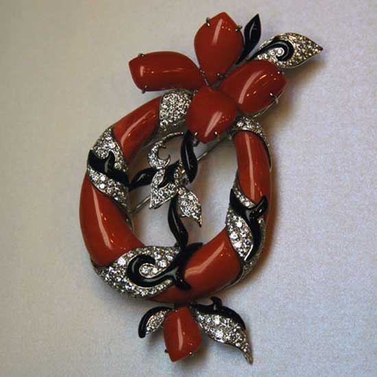 The delicate brooch comes in a tied ribbon shape with coral setting. It is encrusted with onyx and diamonds for a decorative touch. Accessorize an attractive outfit with this gorgeous brooch.