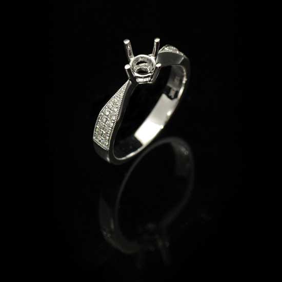 The diamond ring mounting features a thin-band design highlighted by clear diamonds. The ring is made of 18K white gold for long-lasting durability. This ring mounting surely will add elegance to your jewelry collection.
