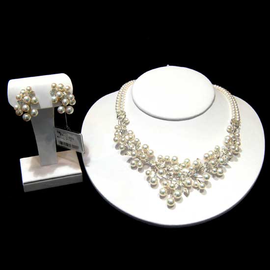 The precious ladies' jewelry set is composed of a necklace and a pair of earrings with a matching design. Each piece of jewelry flaunts a lustrous 18K white gold setting, which is loaded with high-luster Japanese akoya pearls for a sophisticated touch. Perfected by twinkling loose diamonds, this ladies' jewelry set is simply the deserving one to be admired.