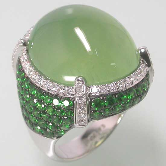 Presented is a gorgeous ring with high-quality 18K white gold construction. It features a round prehnite in the center with diamond setting and tsavorites surrounding them. This elegant ring will complement grand outfits such as evening and party dresses.
