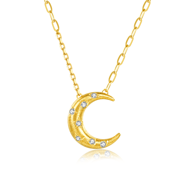 Embrace subtle elegance with this radiant crescent necklace, crafted in warm 18K yellow gold. Inspired by the gentle curve of the moon, its pendant is finished with the delicate rigato texture, creating a soft, lined shimmer that catches the light beautifully. Sparkling diamonds are carefully set along the crescent, adding a touch of brilliance and allure.