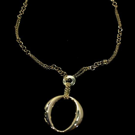 The splendid stampato necklace comes with a golden loop pendant, hanging down a hollow oval ring by tiny golden links. The loop is in a matt finish while the pendant goes with a shiny finish, shimmering in polished delicacy. Ladies' jewelry collection will be incomplete without a stampato necklace.
