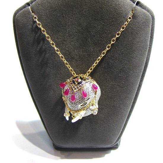 This necklace have a elephant head pendant. The pendant have micro pave set white diamonds. There are 5 teardrop shape ruby hooked on the pendant.