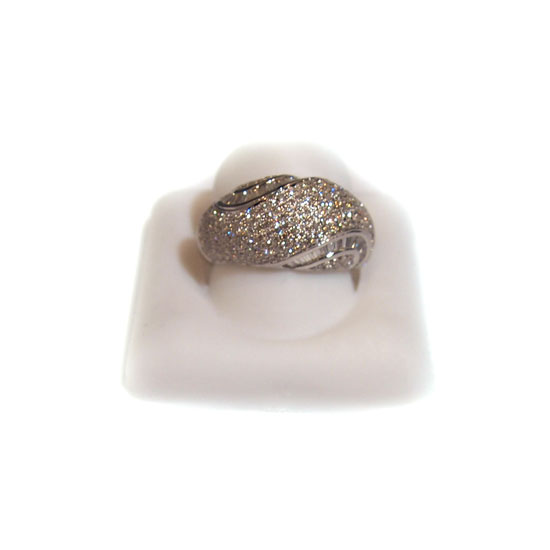 This charming 18k white gold ring features a rounded, streamlined design. It is adorned with glaring sparkling stones for a luxurious look. This finely crafted jeweled ring complements your evening dress perfectly.