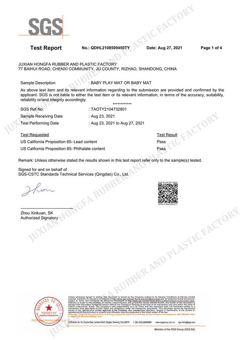 Established in 1994, JUXIAN HONGFA RUBBER AND PLASTIC FACTORY is a professional manufacturer of Baby Play Mat. Our factory has BSCI audit and ISO9001 certificate from UKAS. Our products have certificates such as CE, REACH, UKCA, TUV GS, EU 2015/2115, ROHS, EN 1177: 2018 +AC:2019, ASTM F963, CPSIA, CA PROP 65, et al. We do OEM production for many world-wide famous brands, and we get many promotion product orders from multinational corporations.