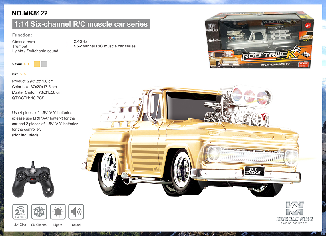 Description: 2.4G 6-channel 1:14 scale remote control muscle truck with music