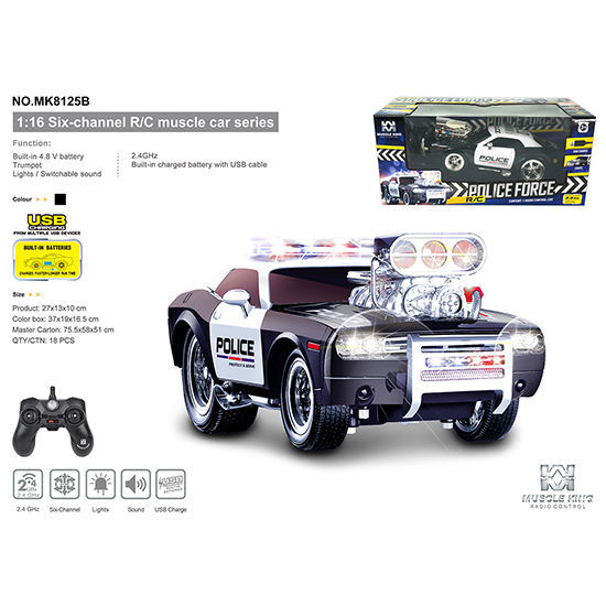 Description: 2.4G 6-channel 1:16 scale remote control muscle police car with music