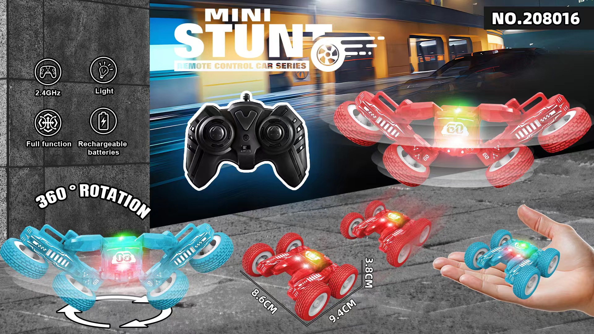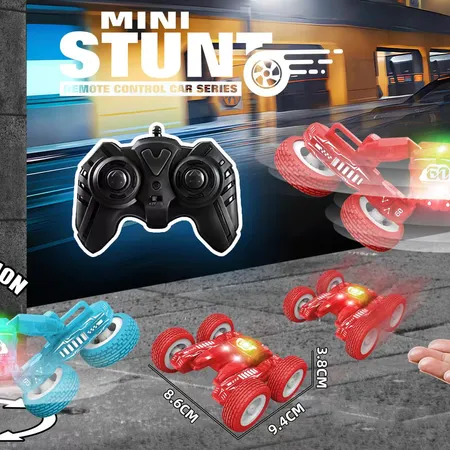 2.4G LIGHT MINI FOUR WHEEL DOUBLE SIDE BLOOM STUNT CAR 1- Play time: 15-20 mins,2- Charging Time: about 60 mins,3- Control distance: 15-20M,4- Car battery: 3.7V 150mAh rechargeble battery (included),5- Remotor Battery: 1.5V AAx2 battery (not included),6- Accessory: USB charger x 1, 7- Product size: 8.6x 9.4 x 3.8cm,8-Function:2.4G,go forward/back,turn left/right,double-sided driving,360 spins,bloom stunt,characteristic light