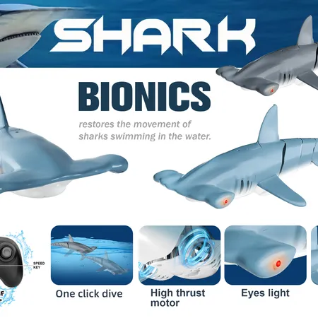 2.4G RC WATERPROOF BIONIC SHARK 1- Play time: 15-20 mins,2- Charging Time: 30-60mins,3- Control distance: 15-20M,4- Swimming Speed:3-4KM/H,5- Body battery: 3.7V 350mAh rechargeble Li-po battery (included),6- Remotor Battery: 1.5V AAx2 battery (not included),7- Accessory: USB charger x 1,manual x 1,8- Product size: 34x14.5 x 11.5cm,9-Function:2.4G,6 channels,water surface and submersible go forward/back,turn left/right,demo,swimming