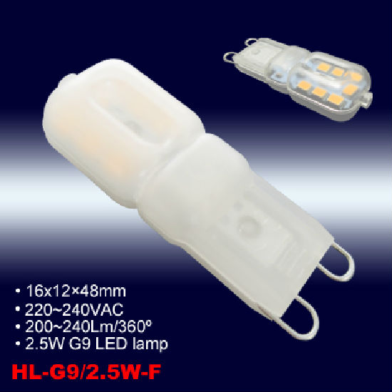 SPECIFICATION: 1) Description: new module 2.5W G9 LED lamp with PC housing 2) Materials: Frosted or clear PC housing 3) Light source: Epistar 0.2W 2835 SMD LED x 14pcs 4) Input voltage: 220-240VAC,50/60Hz,PF:0.4+ 5) Wattage: 2.5W 6) Output flux: 200~240Lm, 90Lm/W 7) View angle: 360deg. 8) Beam color (CCT): 2700K~7000K available 9) CRI(Ra): 80+ 10) Replace: Osram 20W G9 halogen lamp FEATURES: 1) New module,higher cost performance and flux efficiency 2) Instant on,No noise, No flash, No UV and IR 2) Premature failure rate at 1000Hrs.: less than 2% 3) Switching cycles: 15000+ 4) Lumens maintenance at 6000Hrs.: 85%+ 7) Operating temperature range: -25C ~ 45C 5) Long life up to more than 30,000 hours 6) Two years limited warranty 10) Comply with CE,RoHS standards CAUTION: 1) Can't be used in fully enclosed luminaires 2) Suitable for damp location.