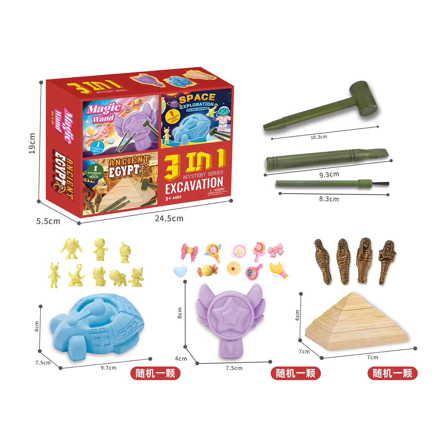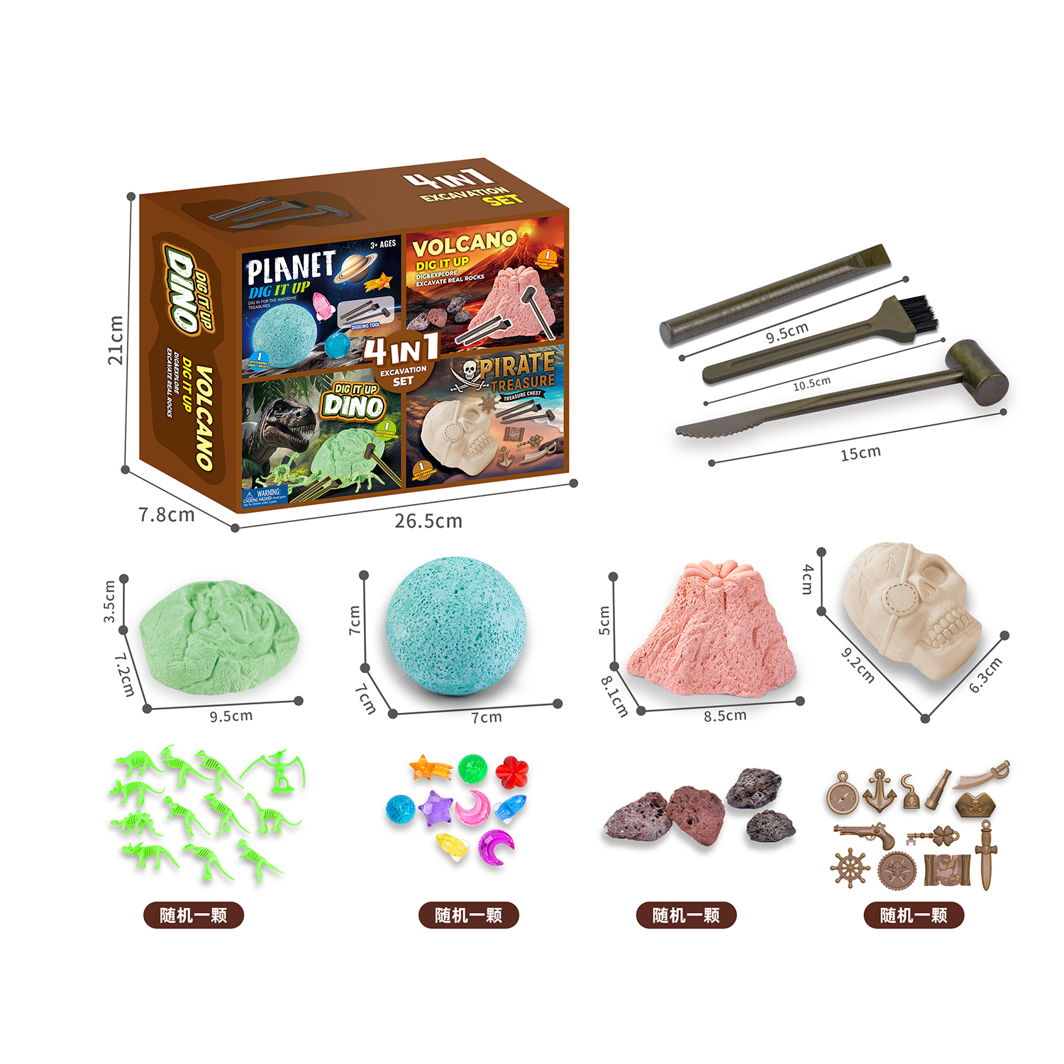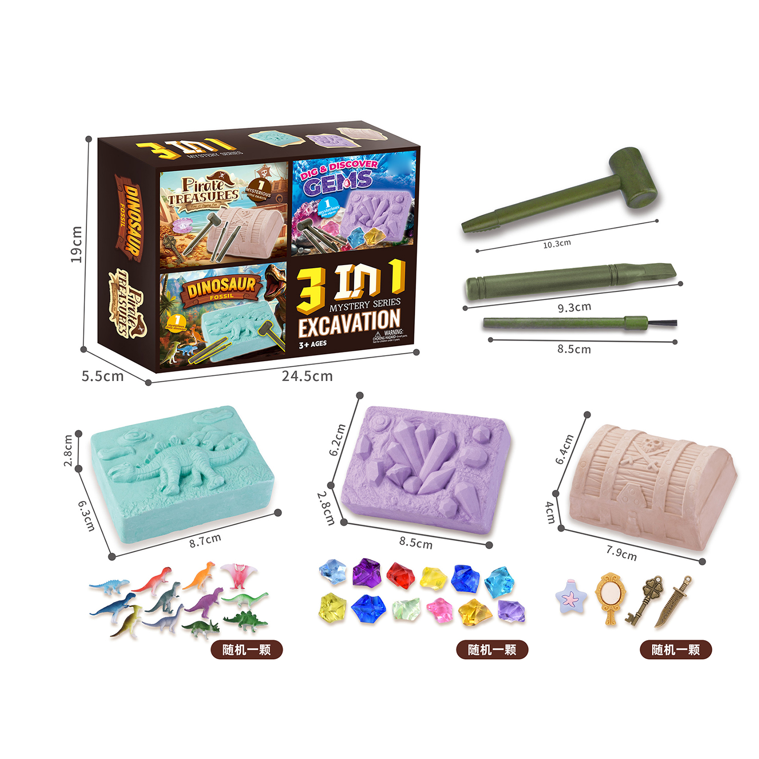 Each Set have 3 excavation tool and 1 pcs of treasures , use excavation tool to break the Model, kids can find treasures inside.