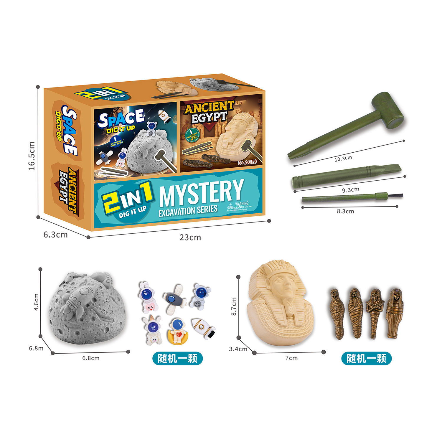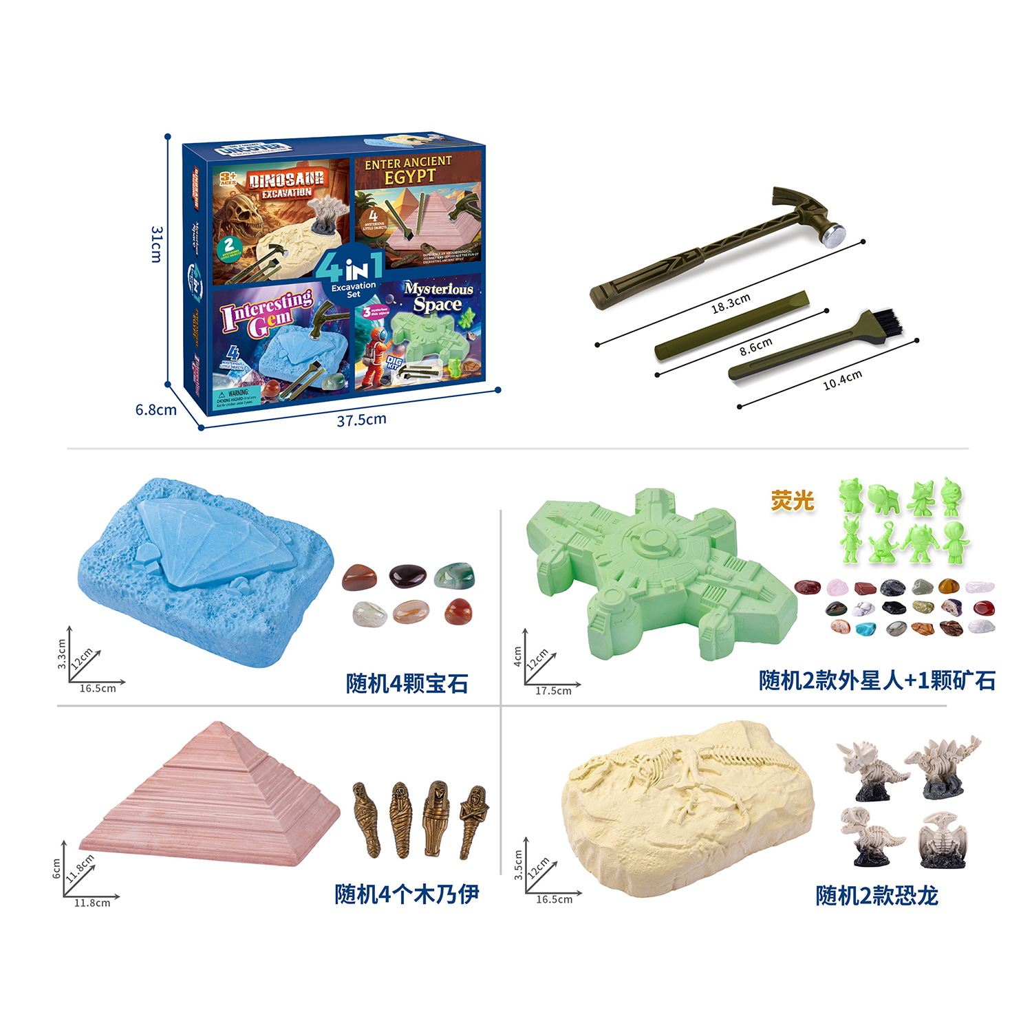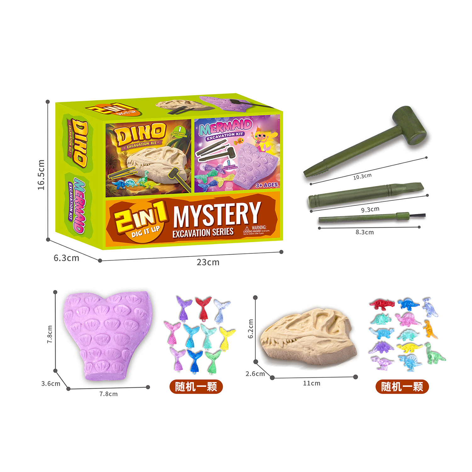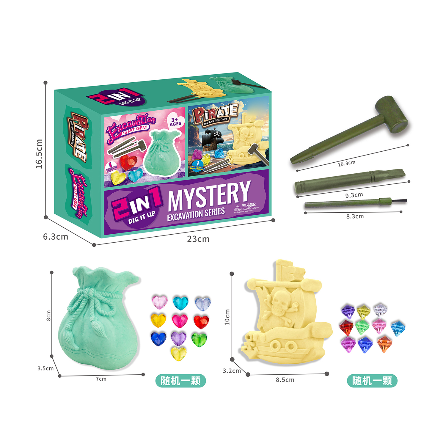 Each Set have 3 excavation tool and 1 pcs of treasures , use excavation tool to break the Model, kids can find treasures inside.