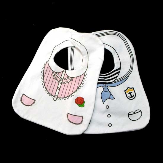 The 2-piece cotton bib set is fashionably designed featuring school uniform styles. It is incredibly soft and the magic tape closure allows for convenient wear. Protect your babies' clothes from stains when food misses their little mouths with this cotton bib set.