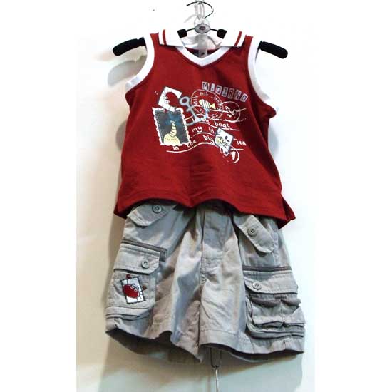 The two-piece kids' garment set comes with a sleeveless T-shirt in red and a pair of fashionable twill shorts with versatile pockets. The eye-catching prints and embroidery offer a charming style. Your little boy will look great in this garment set.