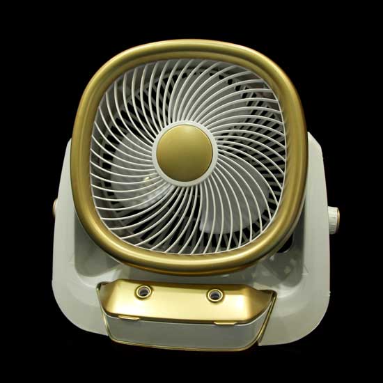 The showcased turbo fan comes in a compact design in white and gold. It boasts three streamlined blades that produce powerful air flows. The table fan also serves as a humidifier for extra functionality.