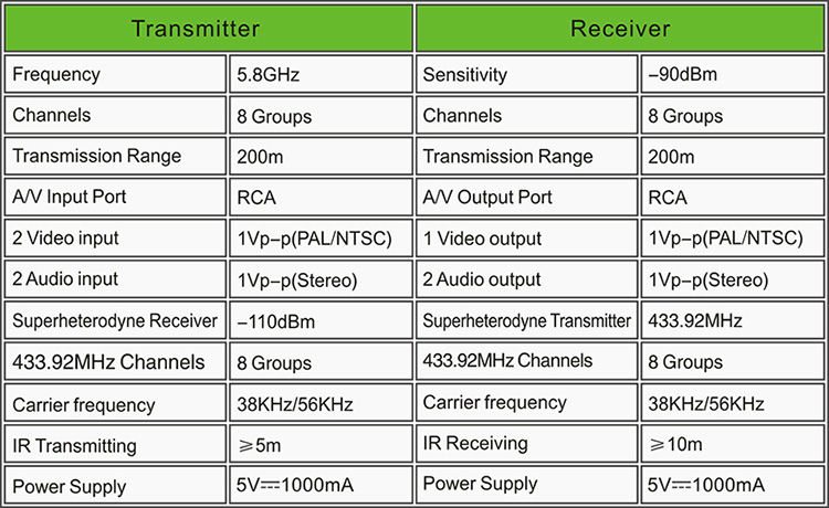 6. Support 5.8GHz wireless channel remote switch, AV signal switch, IR remote control at receiver end.