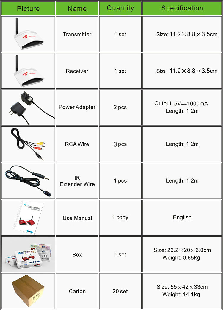 9. Transmitter have built-in infrared signal emission or have infrared transmission extension cable, so that you can do remote control the signal from DVD, DVR, STB, IPTV and other device.