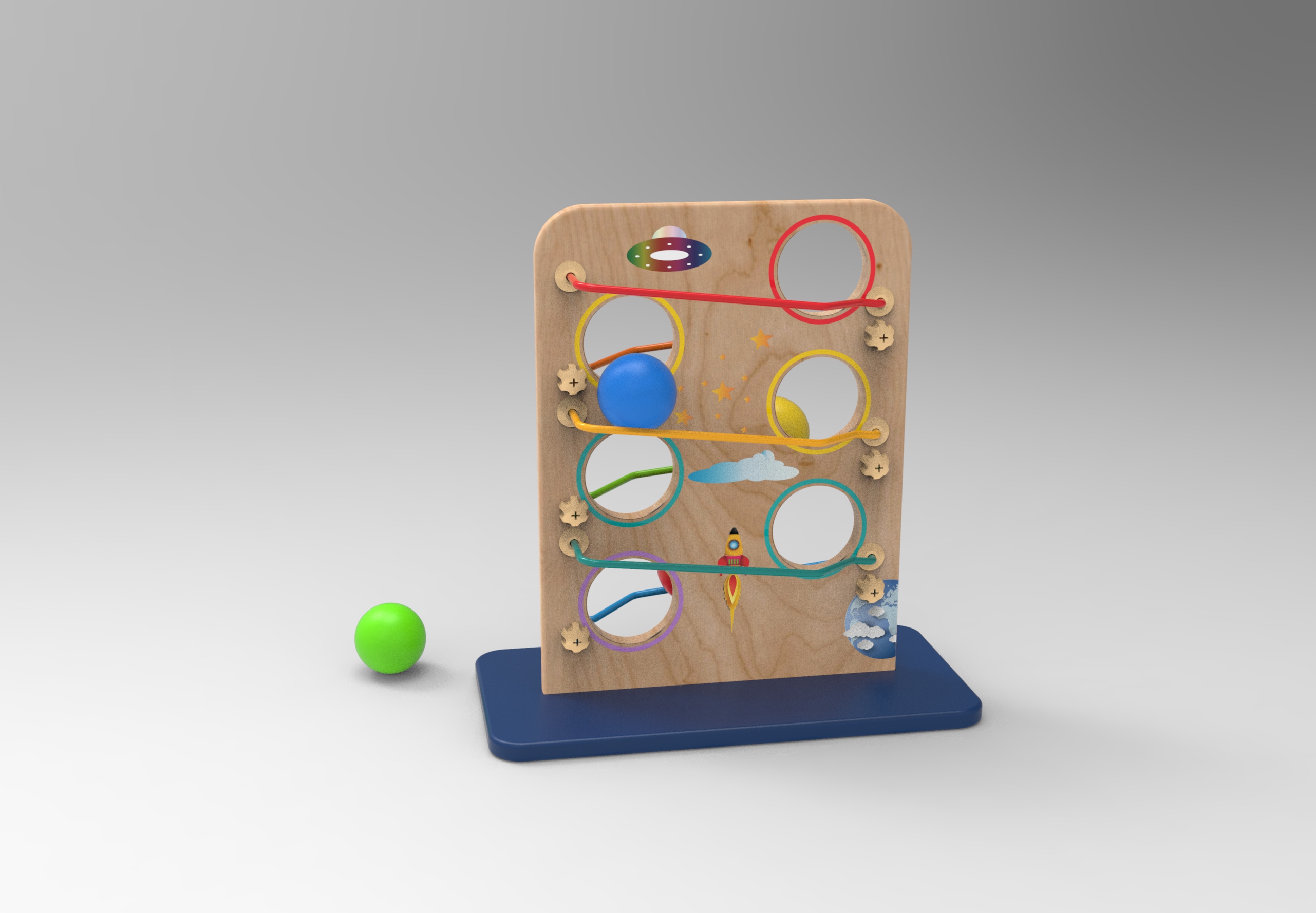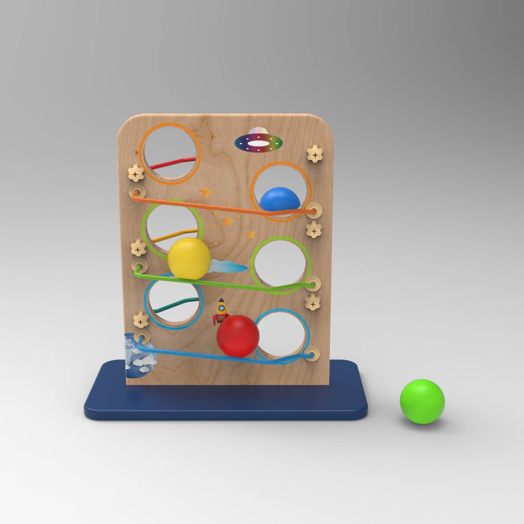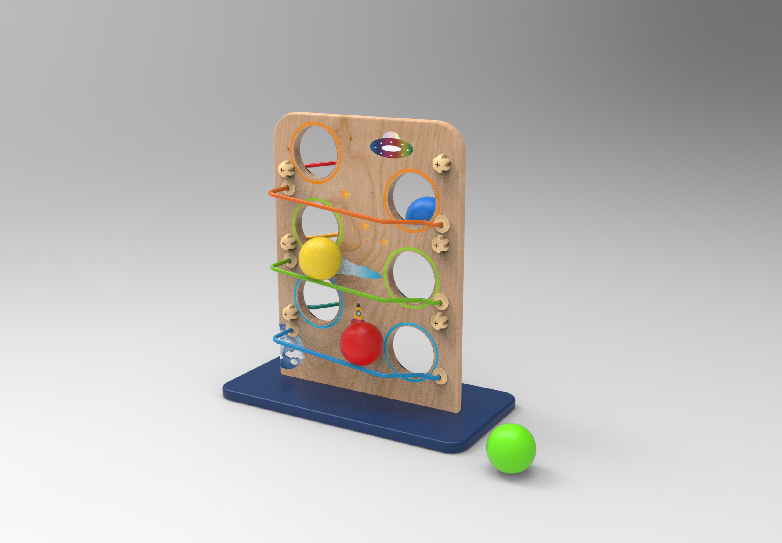 When the ball falling down from rail to rail , makes sound to catch children's attention.