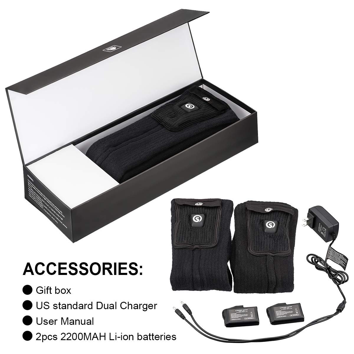 Savior heated socks includes a pair lithium-ion rechargeable 7.4V 2200mAh batteries.the gloves will last up to around 6.5 hours on the lowest setting , 3-3.5 hours on the medium setting and about 2 hours on the highest. If need to doing sports or work in outside very long time , suggest to buy extra batteries (sold separately).