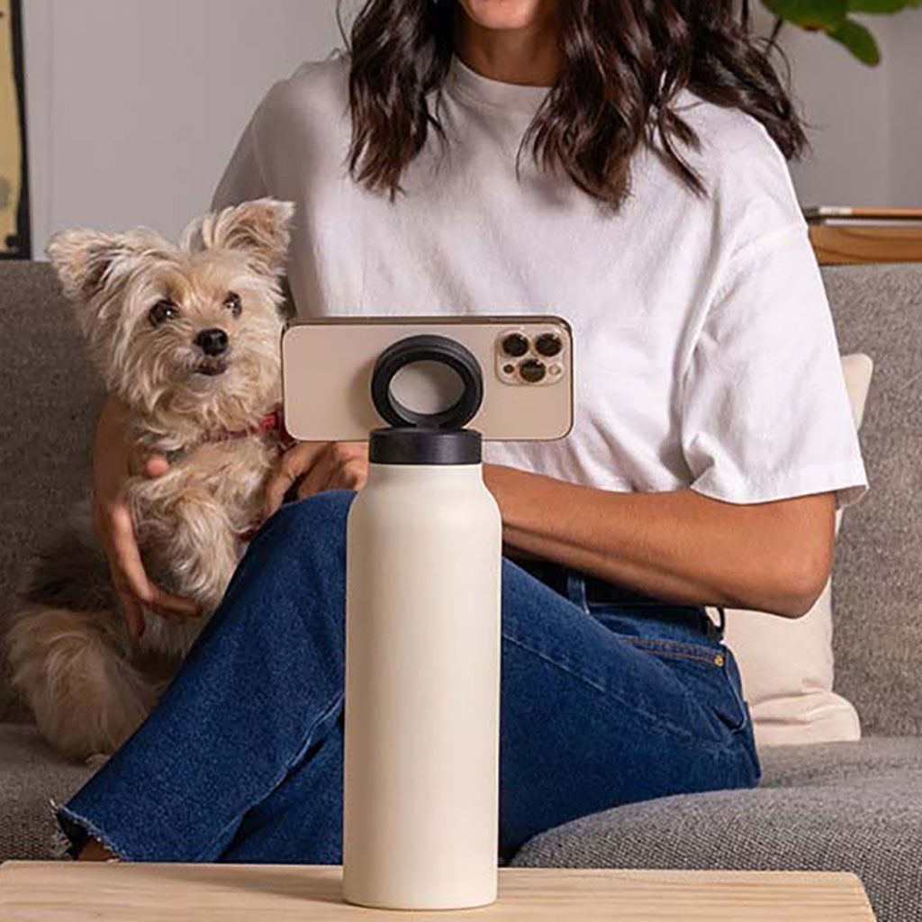 - Features a leakproof lid with integrated magnetic phone holder that keeps drinks and device together