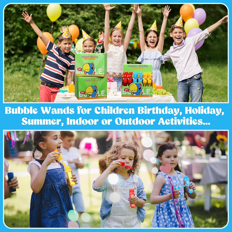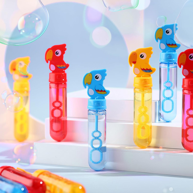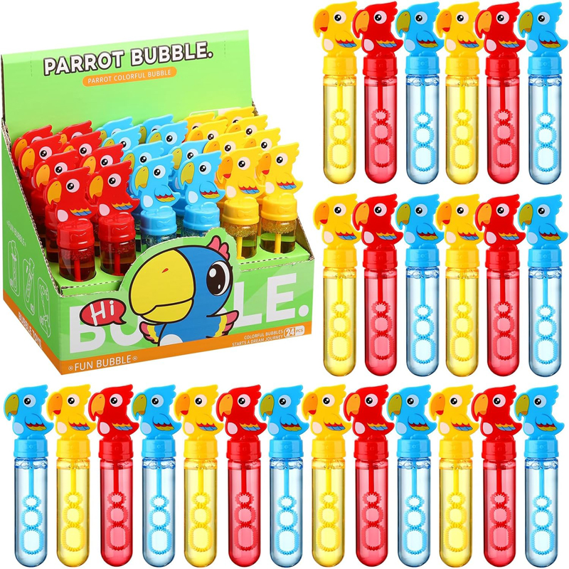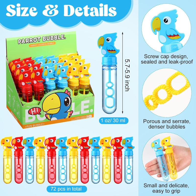 1.Parrot Themed Design: you will receive 24 cute parrot bubble wands, including 3 different colors ensuring that the fun never stops; These parrot styles not only increase children's interest in playing but also help to cultivate recognition for parrot; Please rotate the lid with a threaded opening when using it, do not rotate the parrot 's body 2.Pocket Bubble Toys: they are about 5.7-5.9 inches tall and the capacity is about 1 oz/ 30 ml, a comfortable size for kids to hold and carry; Our bubble blowing toys boast a sealing design with a rotating cover that ensures no leakage even when upside down; This smart design means less mess, more bubbles, and a worry free time 3.Quality and Safety: our bubble wands are crafted from durable, non toxic, and odorless ABS plastic; Each bubble wand is prefilled with a bubble solution made from soap concentrate with delicate bubbles that leave no marks 4.Versatile Bubble Makers: the 3 hole widened design makes the bubbles more dense; When you wave or gently blow air into bubble sticks, they will produce many bubbles of different sizes; These bubble wands are not just limited to kids' parties; They also make great gifts for school events, outdoor camping, weddings, prize boxes, and even gift bag stuffings; This versatility makes our bubbles party favors the ideal choice for any occasion 5.Party Favors: our parrot birthday party favors, parrot bubble wands, are a hit at any social gathering; They are good for themed birthday parties, Easter basket stuffing, classroom rewards, and holiday celebrations; Whether it's for Christmas, Halloween, or Thanksgiving, these bubble wands add a touch of fun