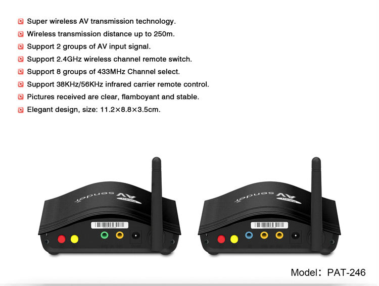 6. Support 2.4GHz wireless channel remote switch, AV signal switch, IR remote control at receiver end.
