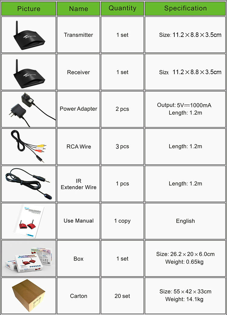 10. Support video transmission of PAL/ NTSC system and stereo audio transmission, Pictures received are clear, flamboyant and stable.