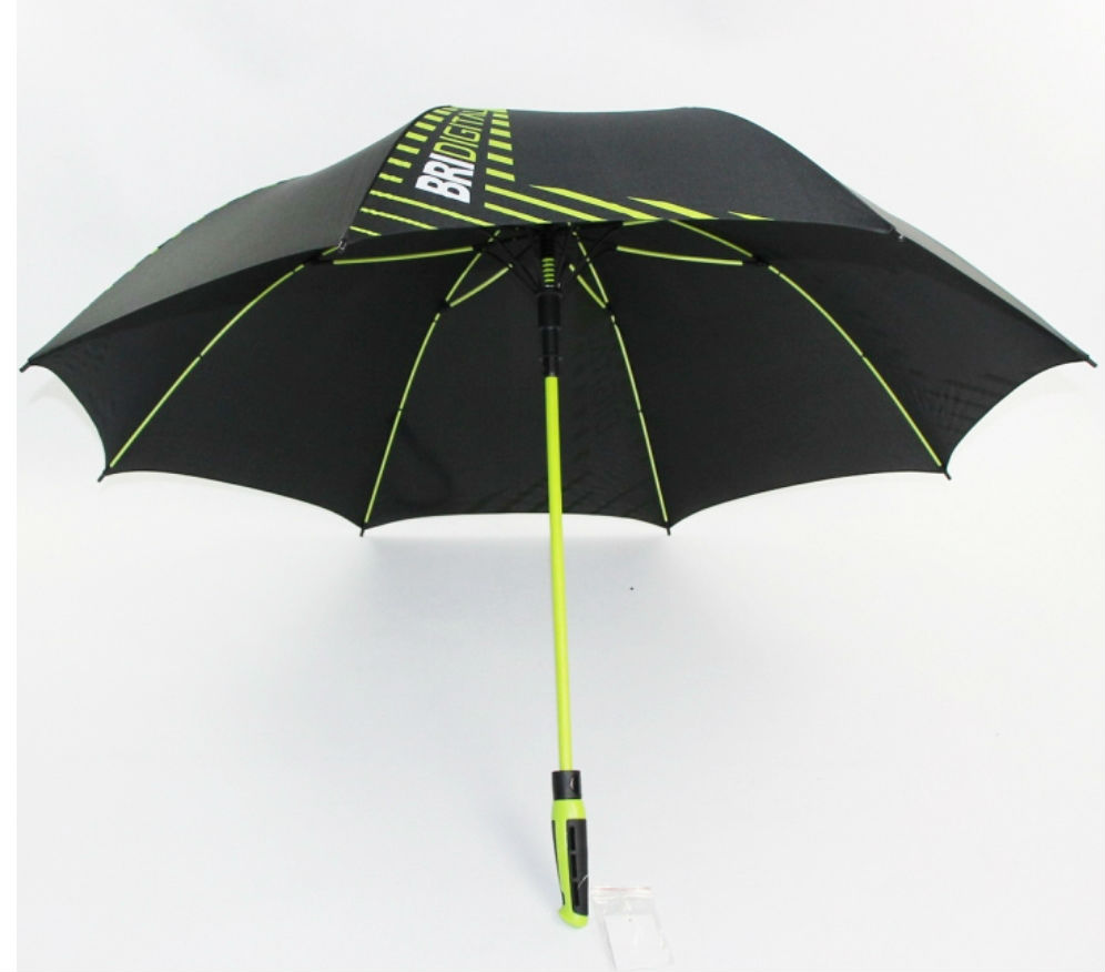 27" x 8 ribs automatic golf umbrella. Pongee layer with silk printing, colorful fiber frame, PVC shaft, TPR handle.