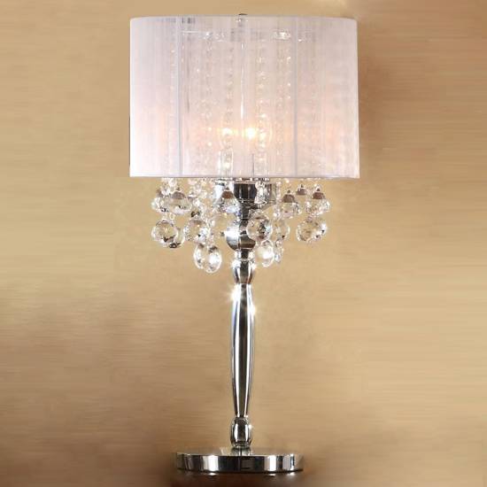 The table lamp features hanging strands of crystal elements which glows with three lights inside. The rectangular wireframe shade is finished with a semi-transparent white mesh cover.
