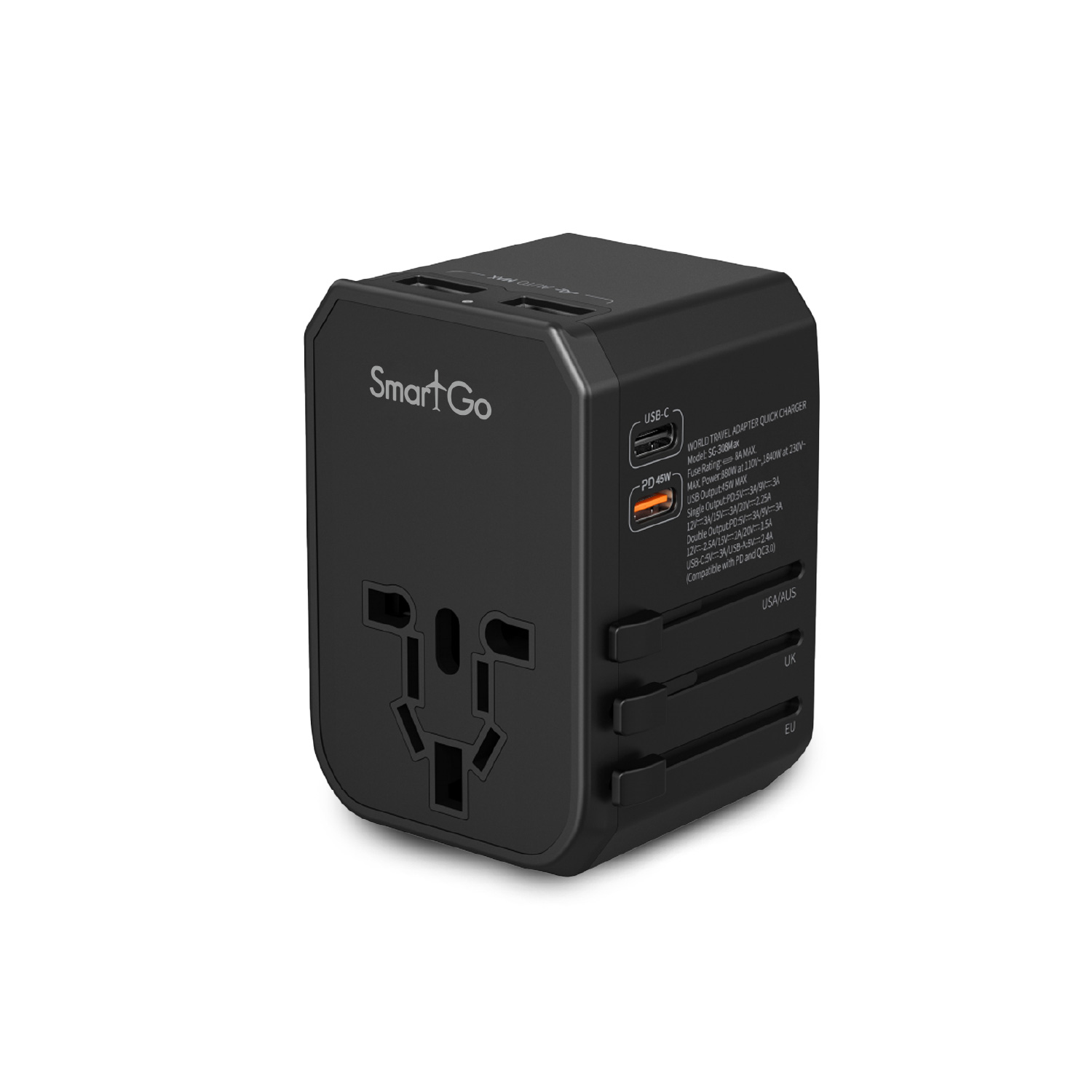 • Covers 150+ countries with US/UK/EU/AU plugs, can easily switch to the suitable type of plug Smart USB ports with intelligent current distributor, works with type-C laptops, iOS and Android devices and almost all USB devices