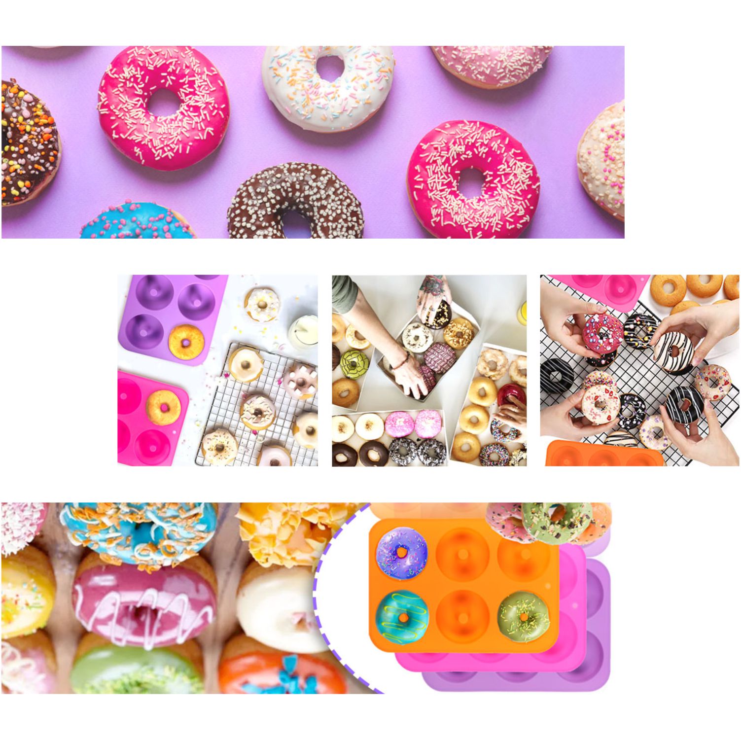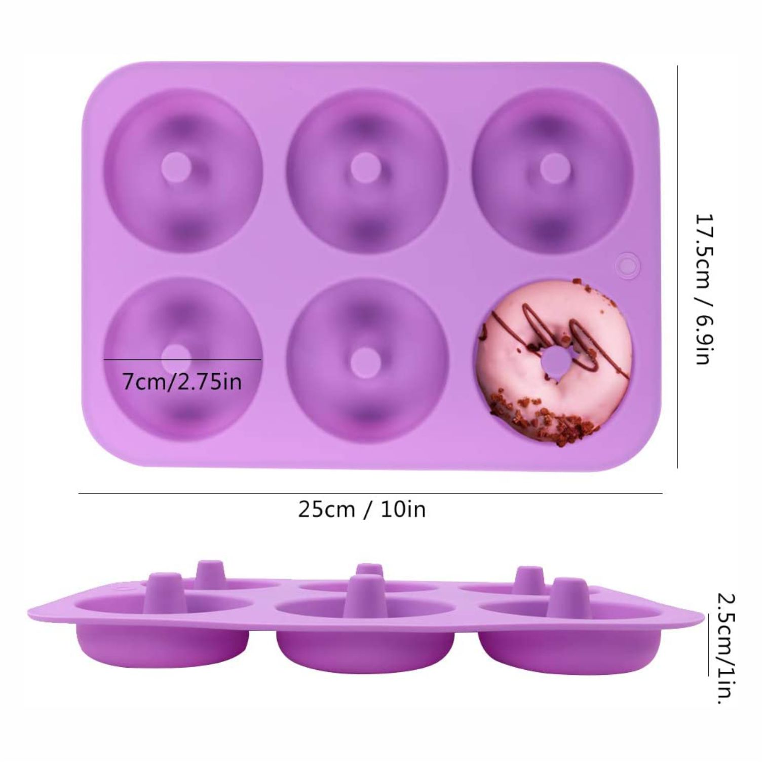 Specifications: 3 silicone donut molds (rose/purple/orange) . A total of 6 cavities, single cavity diameter is 7cm/2.75in, depth is 2.5cm/1in.