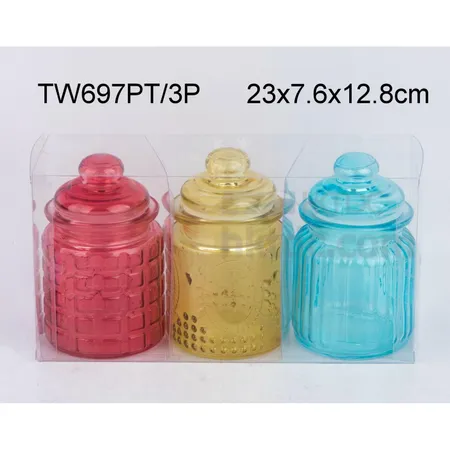 Description: 3pcs glass candy jar set sprayed with color with PVC box