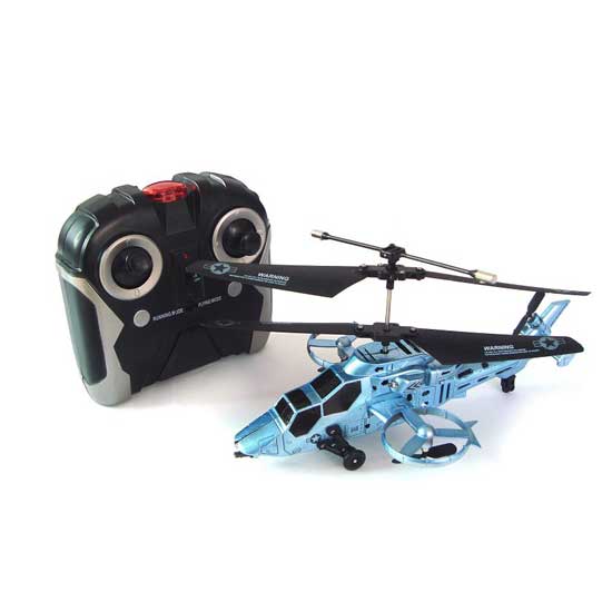 Introduced is a 4-channel electric R/C helicopter in futuristic metallic blue. Great for people of all skill levels, this R/C helicopter features a coaxial rotor and a single rear rotor for precise control. The 4-channel control will allow you to go forward, backward, up, down, left, right and hover. This RC helicopter has a metal body making it strong yet light weight so you don't have worry about breaking anything when you land it a bit too rough.