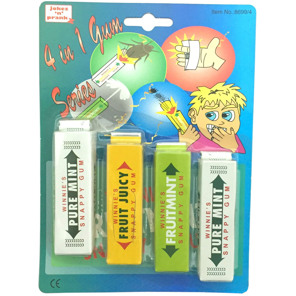 Featured here is a set of four toy gums with different tricks for pranking use. The set includes two gums with snapping insects, one gum with squirting water and one gum with zapping effects. They are excellent for surprising people and will bring children lots of fun.