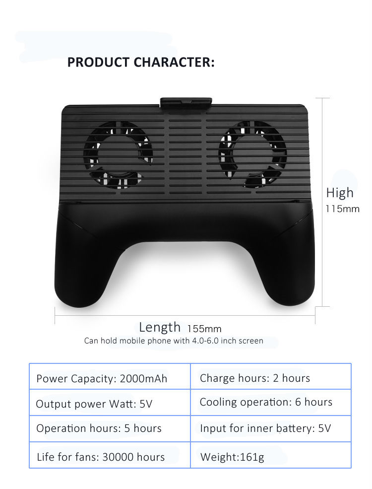It works as mobile phone holder, game handle, mobile ventilation and power bank, mobile charger