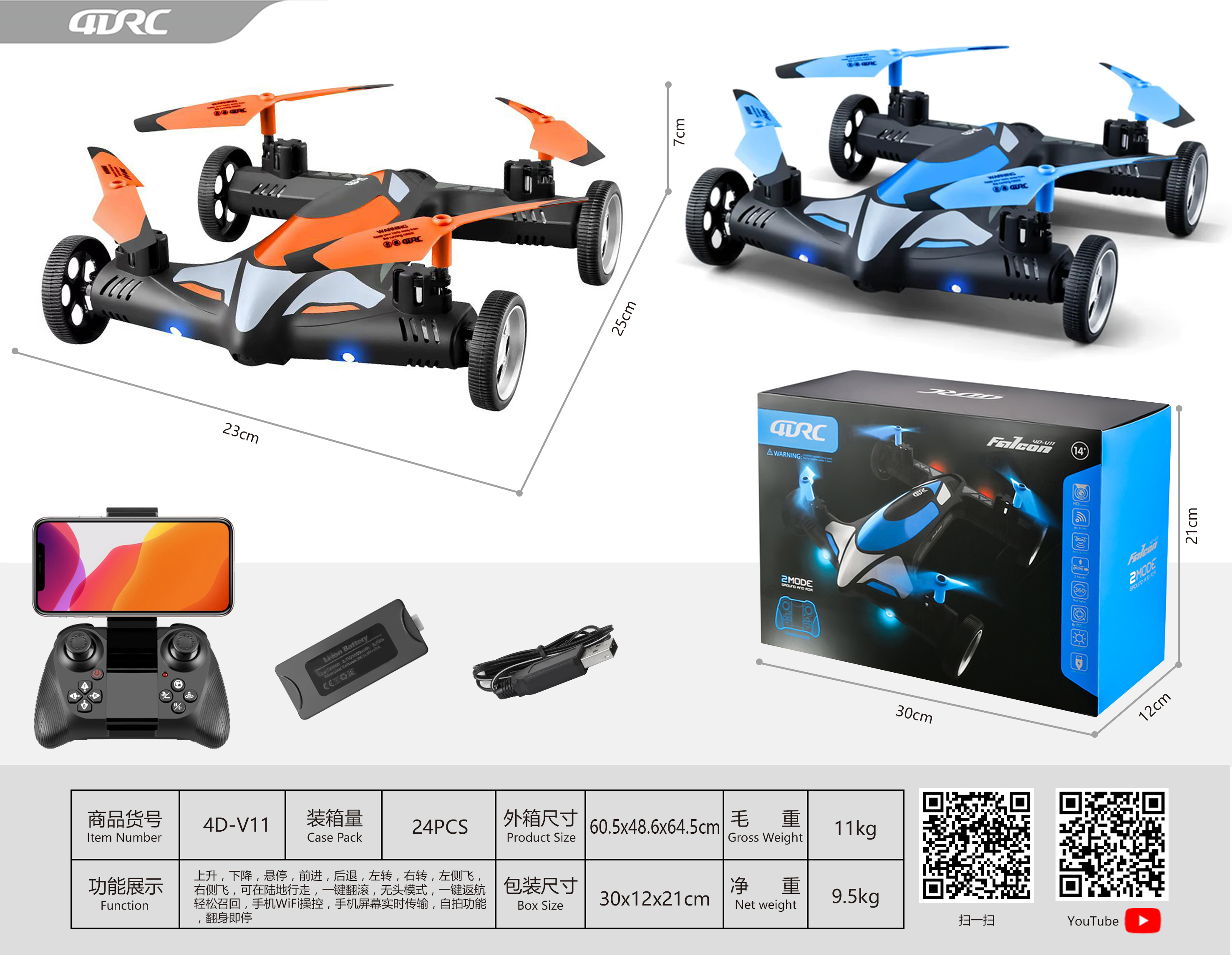 Function: One key take-off/landing, Forward/backward, Turn left/right, Left/right side-flying, Ascent/descent, Altitude hold, Auto hover/flip, Headless mode, Roll over to stop. (Only Available for Camera Option, WiFi camera with selfie, APP FPV real time transmission)