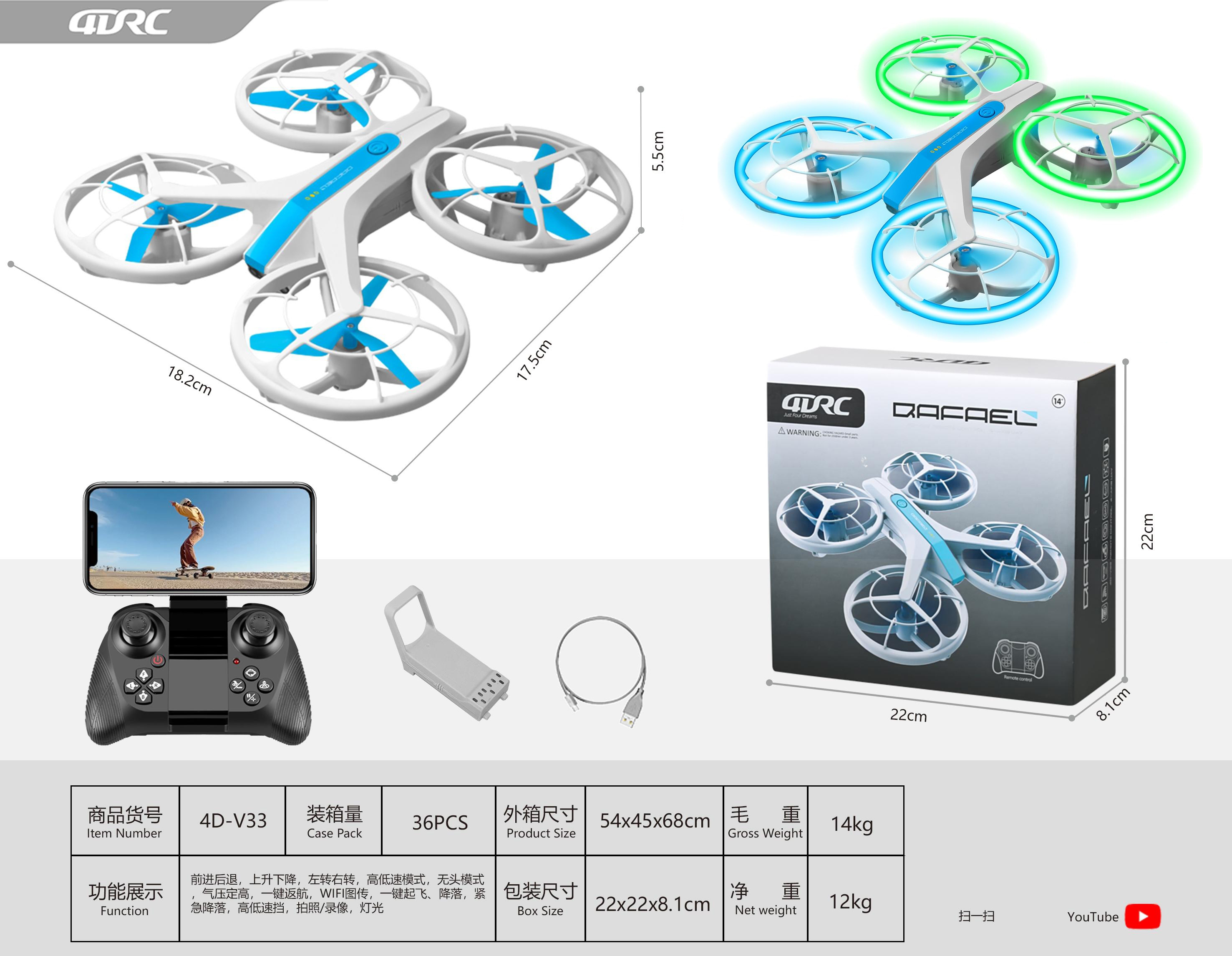 Function: One key take-off/landing, Forward/backward, Turn left/right, Left/right side-flying, Ascent/descent, Altitude hold, Auto hover/flip, Headless mode, Roll over to stop. (Only Available for Camera Option, WiFi camera with selfie, APP FPV real time transmission)