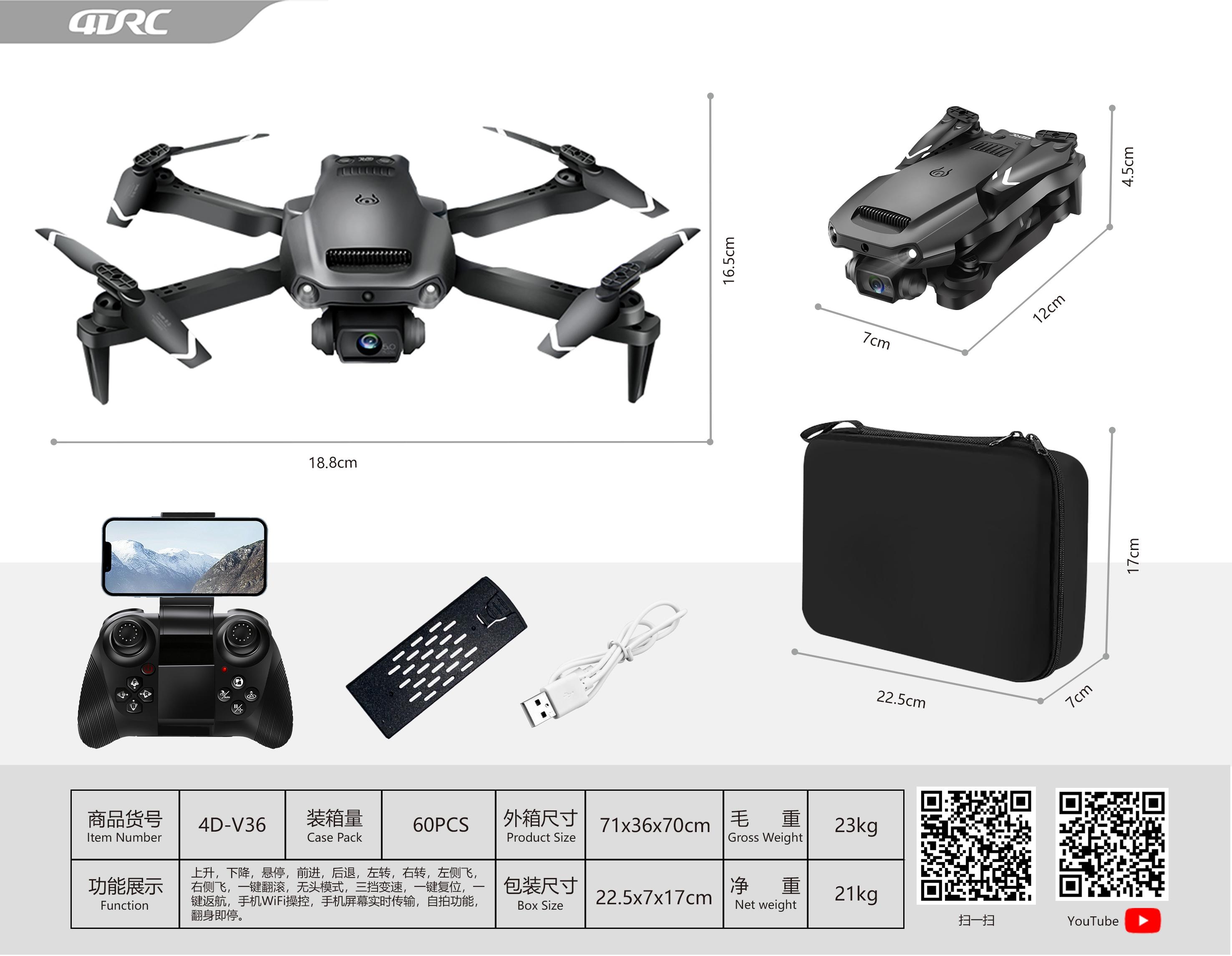 Function: One key take-off/landing, Forward/backward, Turn left/right, Left/right side-flying, Ascent/descent, Altitude hold, Auto hover/flip, Headless mode, Roll over to stop. (Only Available for Camera Option, WiFi camera with selfie, APP FPV real time transmission)