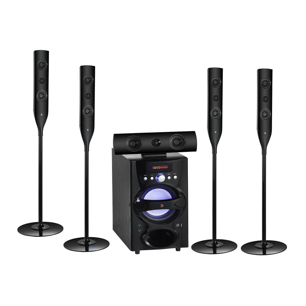 Enjoy true 5.1-channel surround sounds with this home speaker set. This speaker set includes one subwoofer, five satellites and ensures optimal audio performance. The speakers come in a stylish design with LED light effects and are a great addition to any homes.