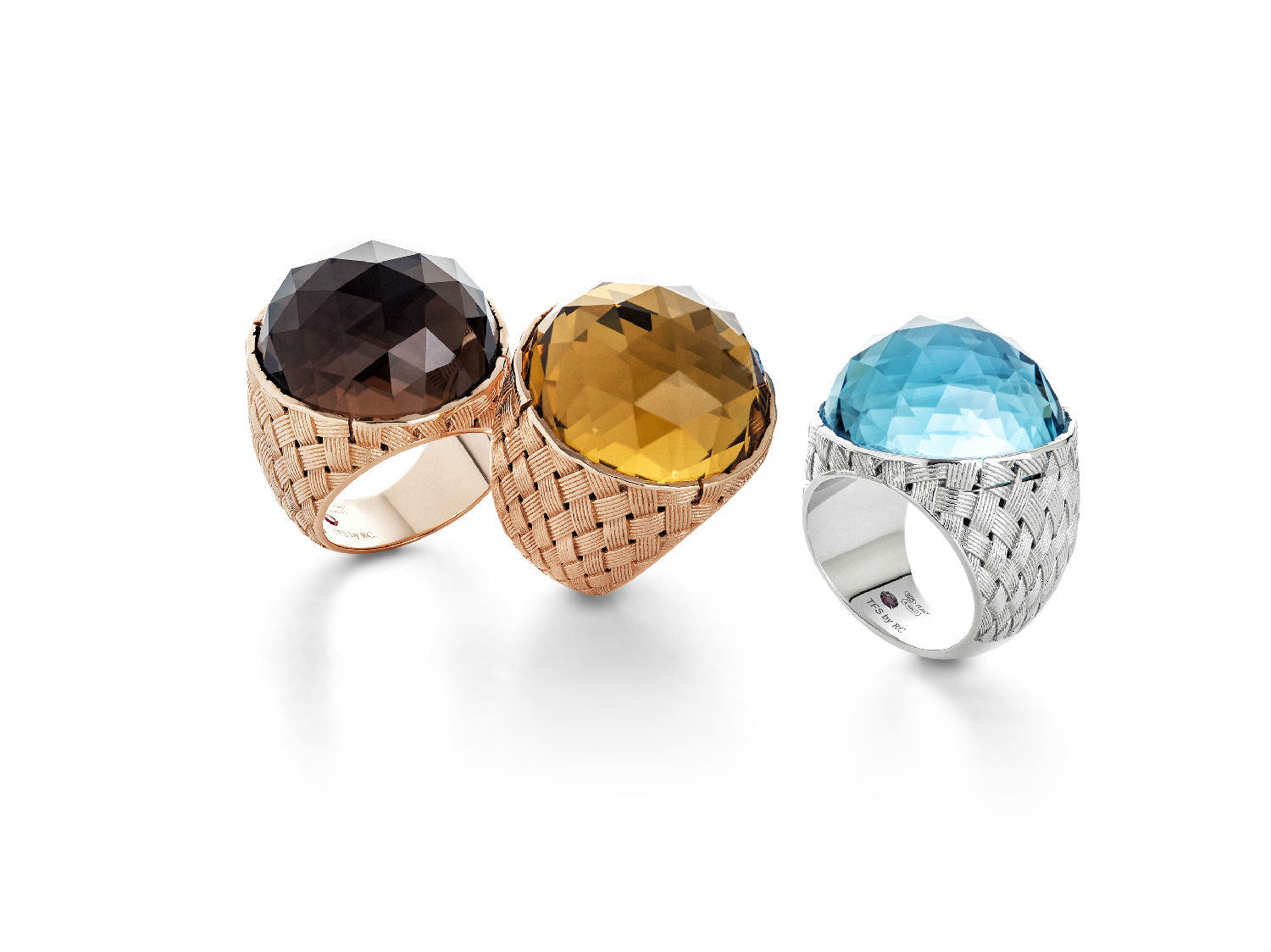 925 woven silver rings plated in rose gold and rhodium with quartz, topaz and citrine.