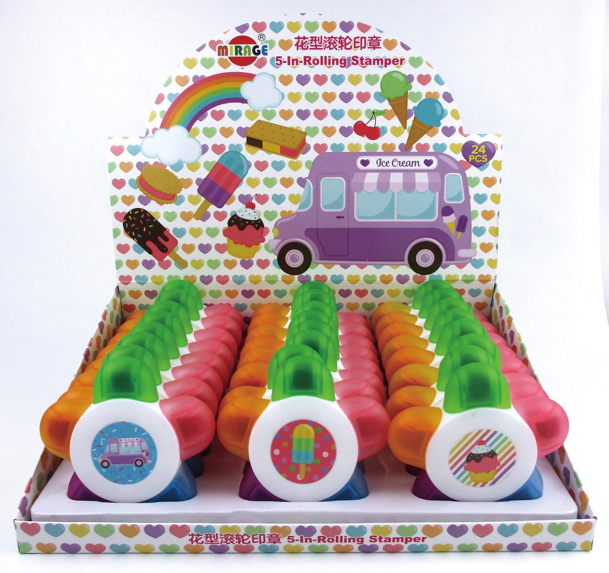 This flower shaped self-inking stamper has 5 different roller stamp designs. Open the cap and roll the stamp lightly in a straight line for the cute designs. Stampers are pre-inked so no need for a separate ink pad. Inks are non-toxic and washable. The sticker and the stamp rubbers may be customized in your designs. We may package these stamps bulk, in display boxes, in blistercards or however you like!