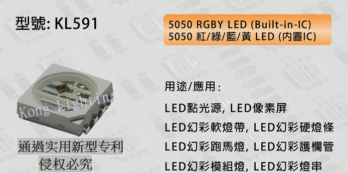 KL591 (RGBYIC LED ) is four channels LED constant current adjustable driver IC with function of internal control synchronizing, which can achieve a wide range of display as MCU inputs one group of data set by constant current and PWM .