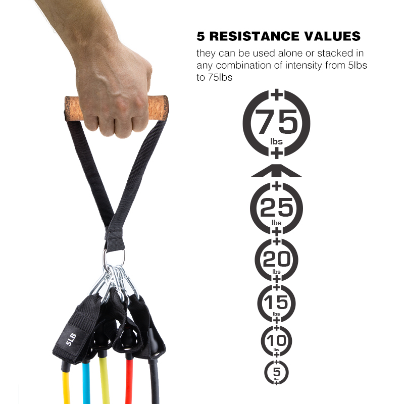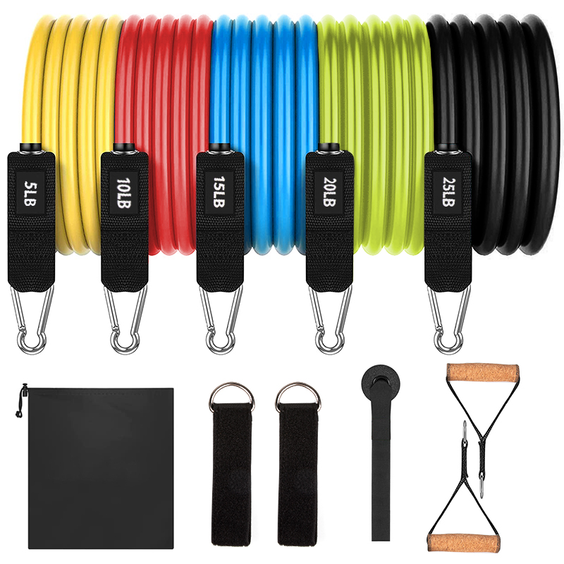 Include 5pcs exercise bands,2 foam handle,2 ankle wrap,1 door anchor and carry bag